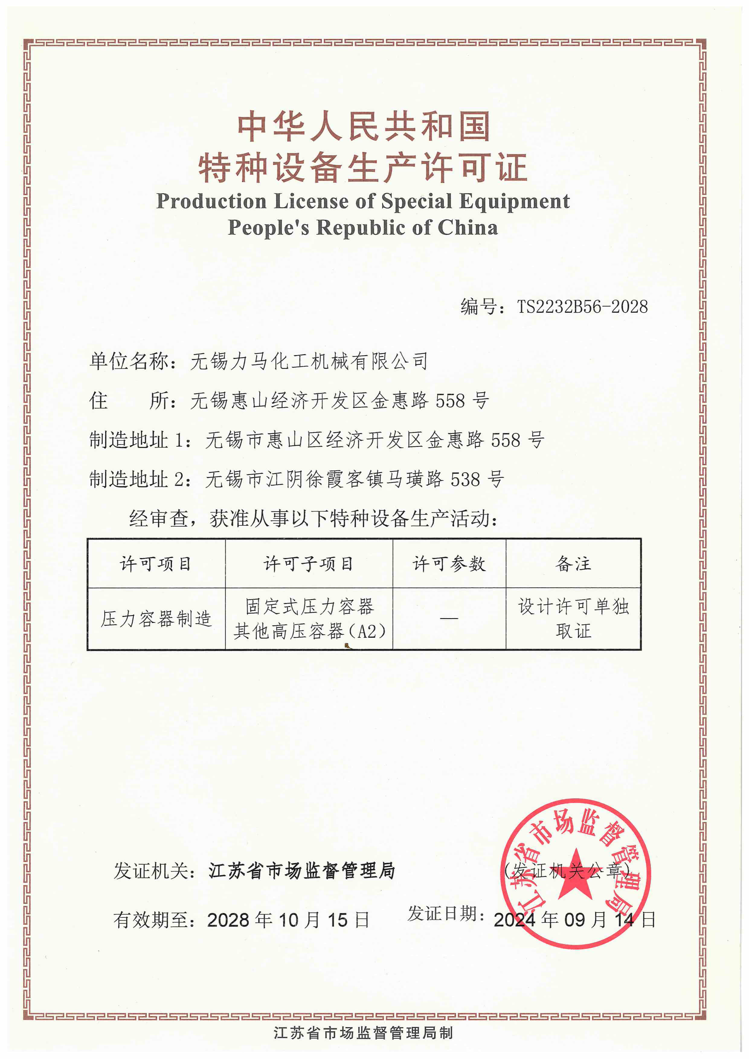 特种设备生产许可证
